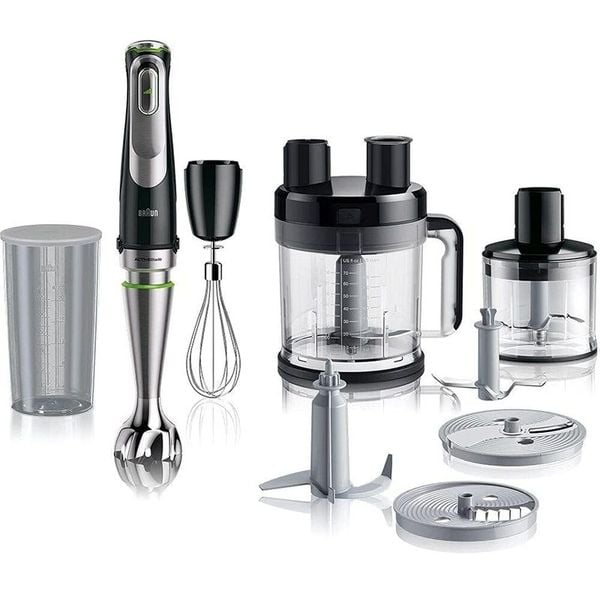 • VERSATILE ATTACHMENTS- The Braun MQ 9185xli comes with 12 convenient attachments- 2L Food Processor, 500ml Chopper, Whisk, French fries disc, Coarse slicing insert, Fine Shredding insert, Coarse shredding insert, Julienne insert, Kneading hook, Ice Crush Knife, BPA-Free 600ml Beaker.